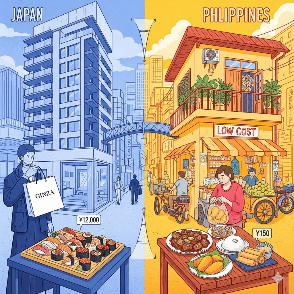 具体的な生活費の比較をしてみると、マニラのマカティ地区(日本でいう銀座のような高級エリア)でも、1ベッドルームのコンドミニアムが月5〜8万円で借りられます。食費は外食中心でも月2〜3万円、交通費は月5,000円程度です。